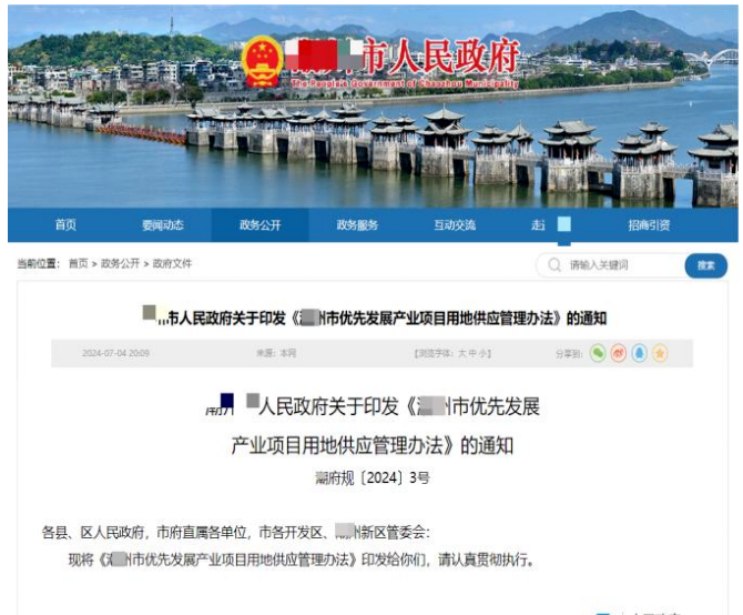 典型示例:《**市优先发展产业项目用地供应管理办法》(*府规〔2024〕3号)已于2025年10月14日废止,但相关信息依旧在网站中展示,并未清理或进行标记“废止”。